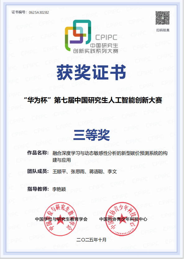 近日,“华为杯”第七届中国研究生人工智能创新大赛全国总决赛在山东青岛举行。我校参赛作品《融合深度学习与动态敏感性分析的新型碳价预测系统的构建与应用》获三等奖,实现了我校在中国研究生创新实践系列大赛中国家级奖项的历史性突破。