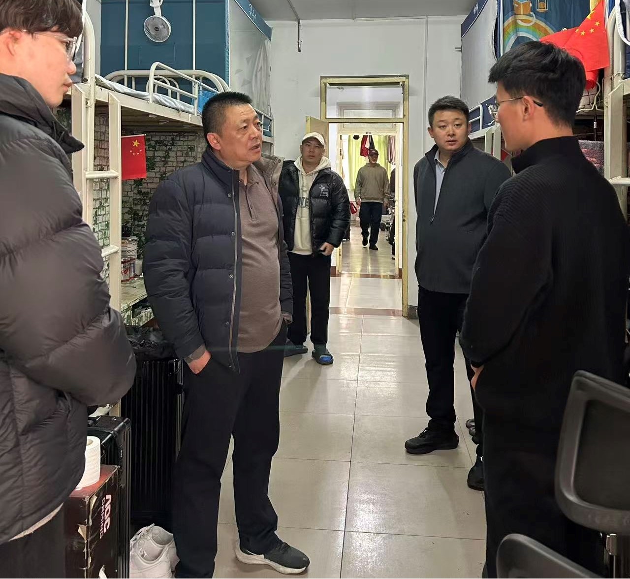走访中,李迪一行仔细检查了各宿舍的卫生状况,重点排查用电方面的安全隐患,反复叮嘱同学们提高安全防范意识,遵守宿舍管理规定。详细询问大家新学期的学习规划、课程适应情况,以及生活中遇到的难题,认真倾听并一一回应。针对毕业年级学生,逐一了解其考研结果、就业进展,耐心解答求职过程中遇到的各类问题,现场给出指导建议,鼓励毕业生调整好心态,抓住春招机遇,勇敢迎接就业挑战。
